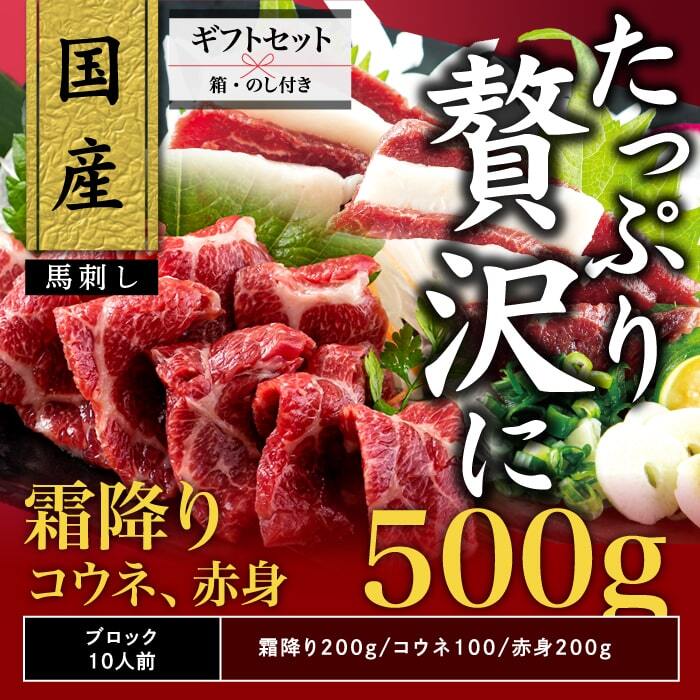 ギフトセット 箱 のし付【国産馬肉】 馬刺し 3種盛り合わせ 500g [ 霜降り コウネ 赤身 ](ブロック) ec-mo-22